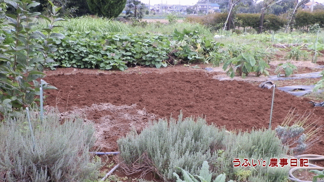 ▼遅れていたニンニクの畑を準備した。グリアス、発酵鶏糞、有機石灰、化成肥料を入れて耕した。