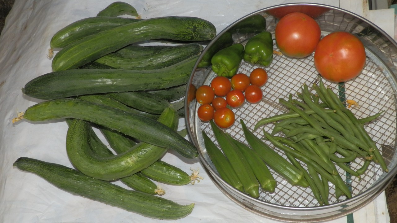 ○きゅうり14本、トマト2個、ミニトマト9個、インゲン29本、オクラ4本、ピーマン2個。